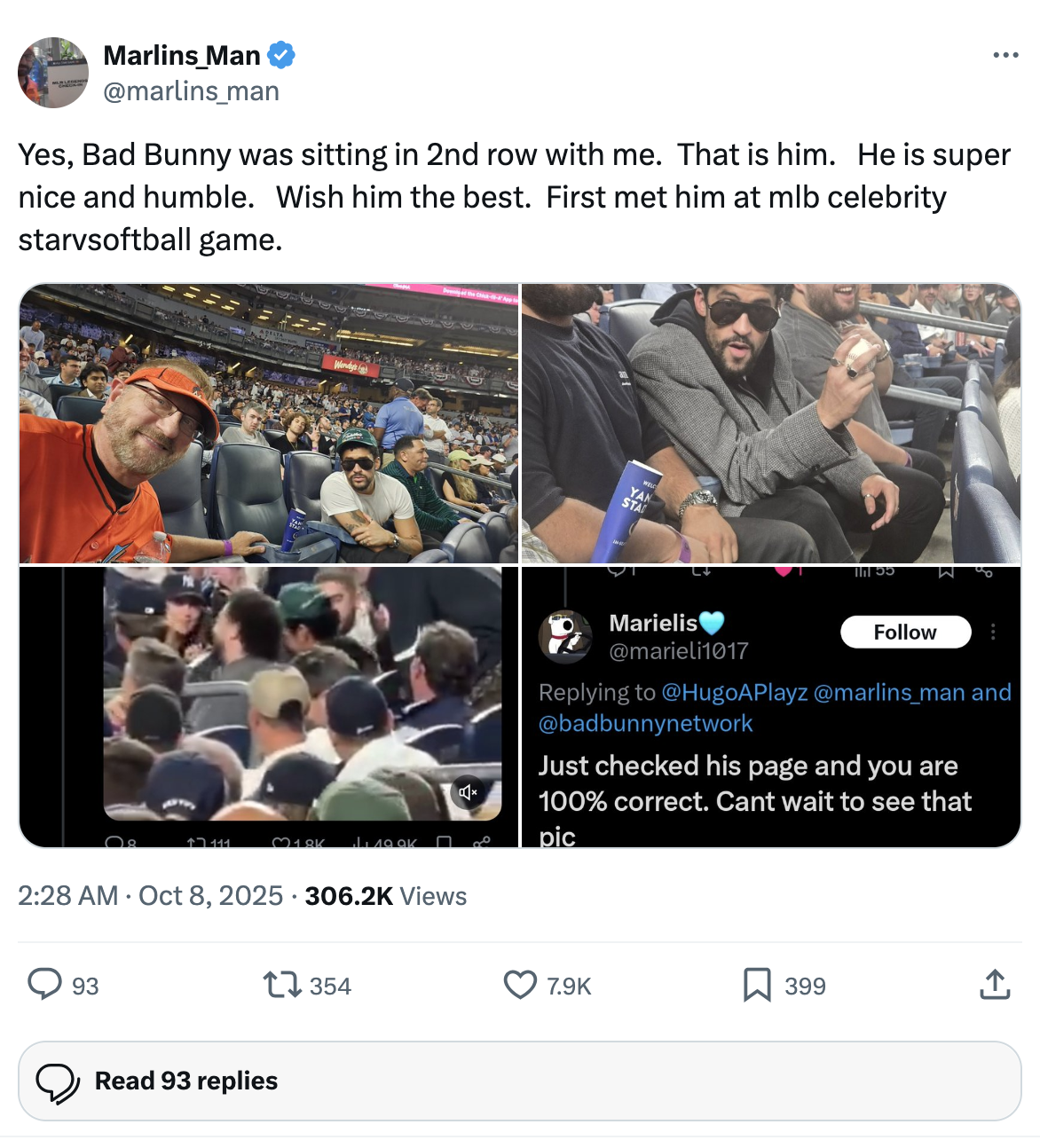 Bad Bunny remained seated during “God Bless America” at Yankee Stadium and the move has sparked more political debate just months ahead of his scheduled Super Bowl halftime performance. The Puerto Rican rapper and global music star was spotted by baseball personality Laurence Leavy, better known as “Marlins Man,” who sat two seats away during the playoff matchup between the New York Yankees and Toronto Blue Jays. The fan, who goes by the online title ‘Marlins_Man’, was in town to watch the Yankees face Toronto Blue Jays. As he took his seat behind the plate for the playoff game, found he was next to the polarizing artist.