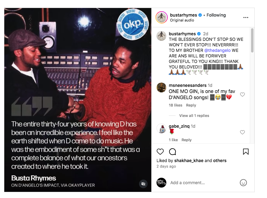 The seven-minute tribute finds Busta Rhymes pouring his heart out over the haunting instrumental of “One Mo’Gin,” a standout from D’Angelo’s revered 2000 album Voodoo. The track, more eulogy than freestyle, walks listeners through their 34-year friendship, beginning with their first encounter in the studio with A Tribe Called Quest. Busta paints D’Angelo as a once-in-a-generation artist: “The man never needed a co-sign, he never needed a voucher/He touched them keys like Escobar in the Medellín/And he touched the souls of the people and everything between/We gotta feel it/And embrace all of his spirit/From the music, whenever we hear it.”