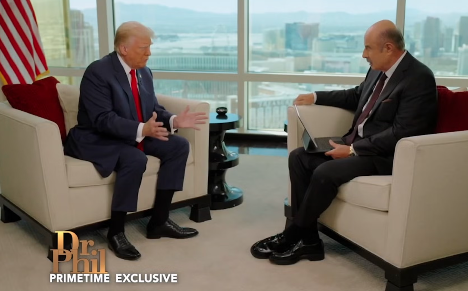 Former President Donald Trump sat down for a one-on-one interview with “Dr. Phil” McGraw as the race to Election Day continues to heat up. Trump’s interview with McGraw, a TV personality and psychologist, aired Monday night exclusively on the Merit Street network and featured several of Trump’s familiar talking points, including attacking his Democratic rival, Vice President Kamala Harris, for her policies on the southern border and the economy. The hourlong conversation has been touted as a two-part special on Dr. Phil Primetime, with McGraw planning to air a sit-down interview on Wednesday with former independent presidential candidate Robert F. Kennedy Jr., who dropped out of the 2024 race late last week and threw his support behind Trump.