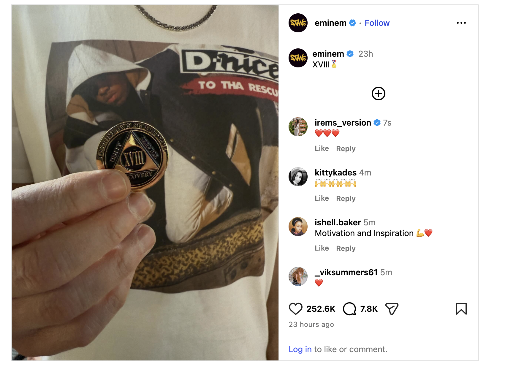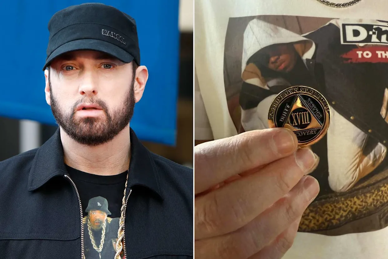 In an April 20 Instagram post, Eminem (born Marshall Bruce Mathers III) shared a zoomed in photo of himself wearing a graphic T-shirt while holding up a coin to mark the special milestone. In his early days, Em was consuming 30 Vicodin pills daily, convincing himself that prescription medications weren’t “real” drugs compared to street narcotics. That twisted logic nearly ended him. In 2007, he overdosed on methadone after mistakenly taking an amount equivalent to four bags of heroin, and doctors told him he was two hours from death.