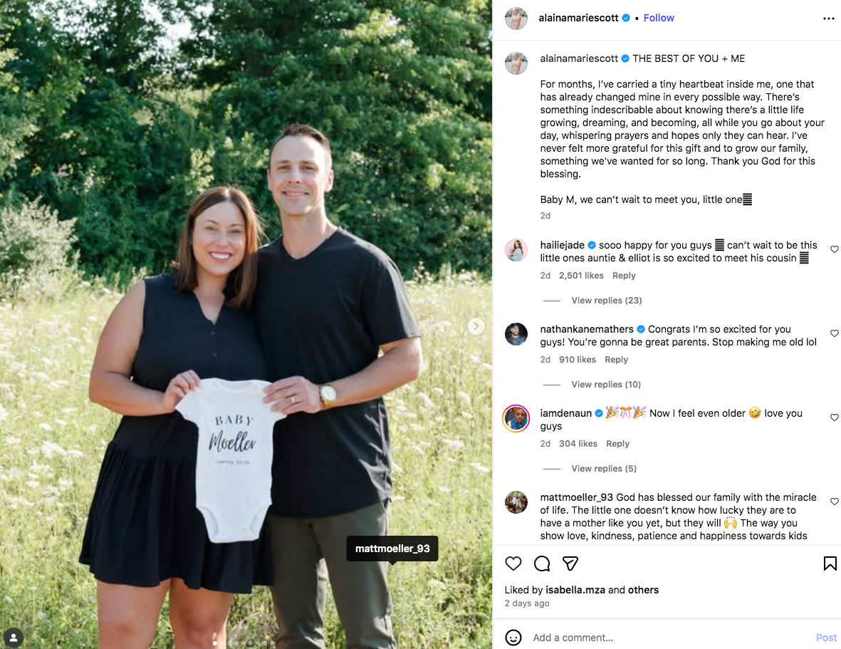 Eminem’s daughter Alaina Scott revealed she is expecting her first child with husband Matt Moeller, making the rap star a grandfather for the second time and expanding his growing family.