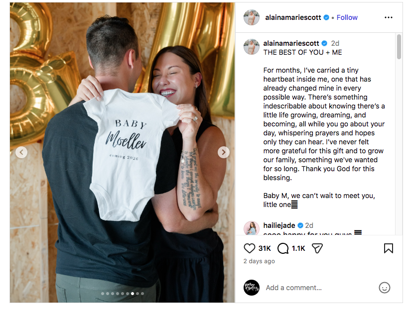 Scott took to Instagram to make the announcement official with a photoshoot awaiting the arrival of her first baby in 2026. She surprised her partner Matt Moeller with the positive pregnancy test and a pair of infant Nike “Panda” Dunks. Eminem’s biological daughter Hailie Jade, who gave birth to her first son Elliot in March, chimed in with some well-wishes for her sister. Hailie Jade honoured her father by lending Em’s first name, Marshall, to her baby boy’s middle name. Hailie surprising Em with news he was going to be a grandpa for the first time was included in the footage of his “Temporary” music video, which found the rap legend getting emotional when receiving a Detroit Lions jersey with “Grandpa” inscribed across the back nameplate.
