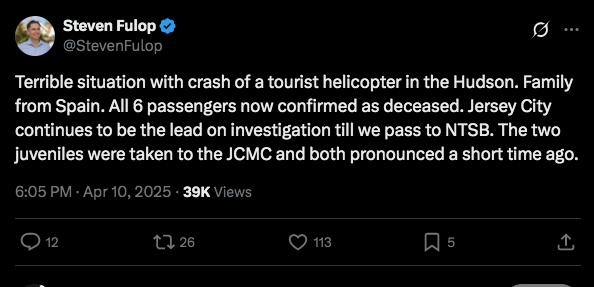 New York City Mayor Eric Adams said the children were 4, 8 and 10 years old. Escobar was in the New York area on business and his family flew over to meet him for a few days, said Steven Fulop, mayor of Jersey City, New Jersey, in a post on Twitter (X). He said a relative would arrive Friday and that officials were working with the medical examiner to release the bodies for their return to Spain. Pieces of the aircraft could still be seen floating in the river Friday morning as divers resumed the search for evidence. The bulk of the cabin was retrieved by crane Thursday night.