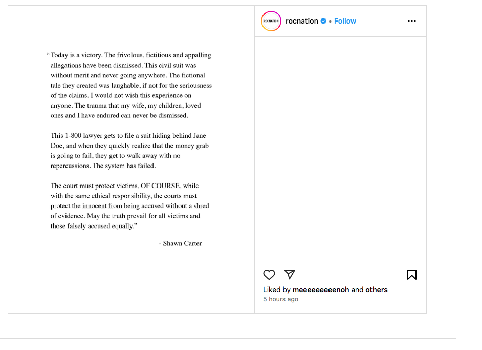 The voluntary dismissal, reviewed by Variety, was filed by attorneys Tony Buzbee and Antigone Curis, claiming that the Jane Doe who accused the musicians of sexual assault “hereby gives notice that the above-captioned Action is voluntarily dismissed, with prejudice.” Because it was dismissed with prejudice, the suit cannot be refiled as it is in its present form. Additionally, Roc Nation, the entertainment company owned by Jay-Z, issued a statement signed by Jay-Z (real name Shawn Carter) calling this a “victory.” In his statement, Jay-Z also says this issue caused trauma for his wife and children.