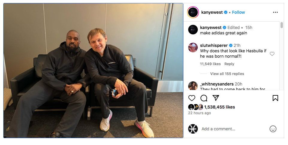 The news came after the brand terminated its partnership with the rapper, stopping all payments to him. Since then, Adidas CEO Bjørn Gulden made it known he doesn’t think West meant the anti-semitic comments he made in the past. Now Gulden and West have been spotted together, Kanye posted a photo of him and Gulden together via his Instagram page: