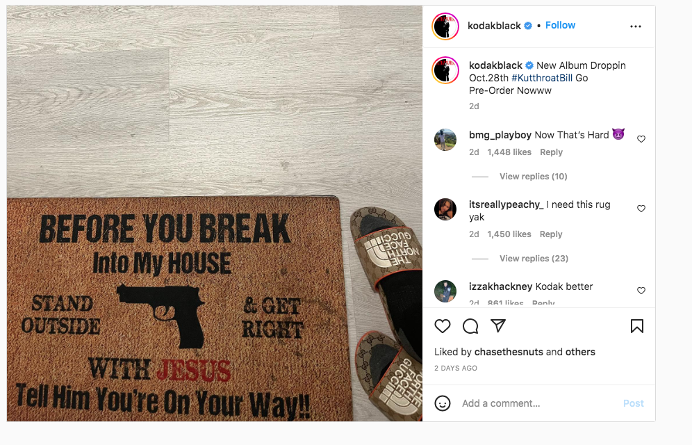 Needless to say, he understands the intent behind a burglary quite well. But, now that his net worth is upwards of $5 million, his wealth is far more likely to be the target of a burglary scheme. To that, the 25-year-old posted a message on his Instagram page, indicating that anyone foolish enough to go through with a burglary scheme at his expense would meet their maker shortly thereafter. Kodak Black posted a picture of a welcome mat that had an image of a gun on it and the words: “Before You Break Into My House, Stand Outside & Get Right With Jesus…Tell Him You’re On Your Way!!”