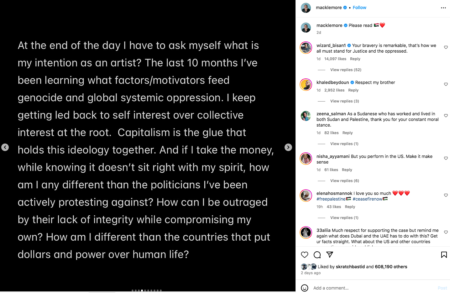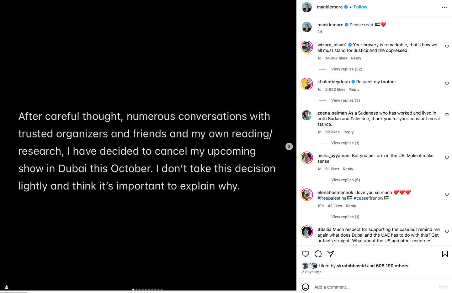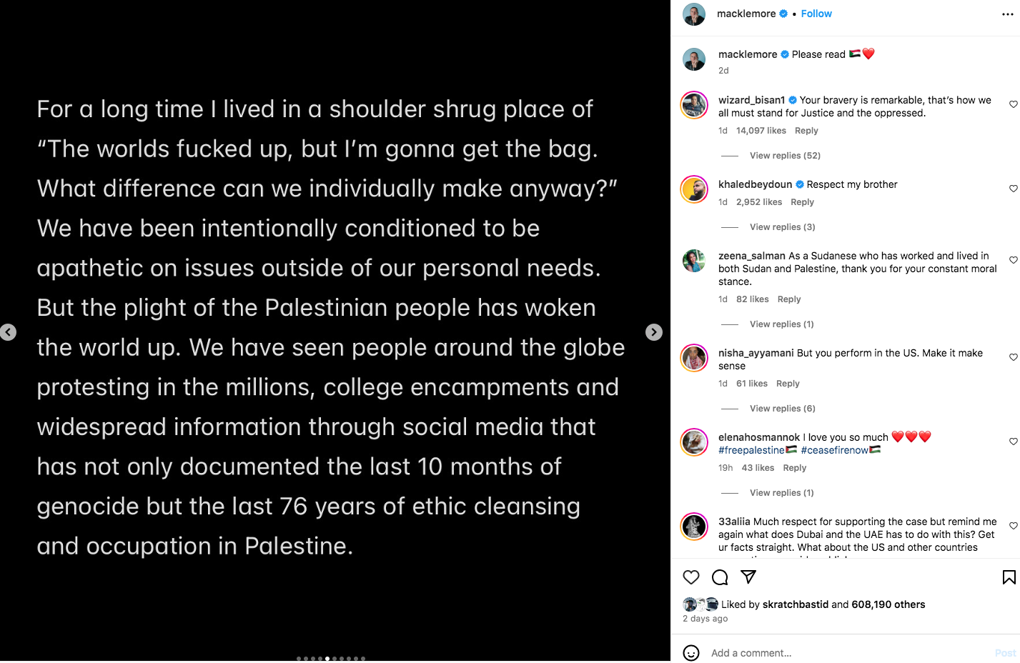 The “Thrift Shop” hitmaker announced he canceled his October show. He took to Instagram with a lengthy statement explaining his decision. Earlier this year, The Seattle-bred rapper released a pro-Palestinian anthem called “Hinds Hall. Macklemore revealed he had been educating himself for the last ten months and said, “the plight of the Palestinian people has woken the world up.” He said that although he might not live to see the “dismantling” of systemic oppression, “our collective analysis is evolving.”