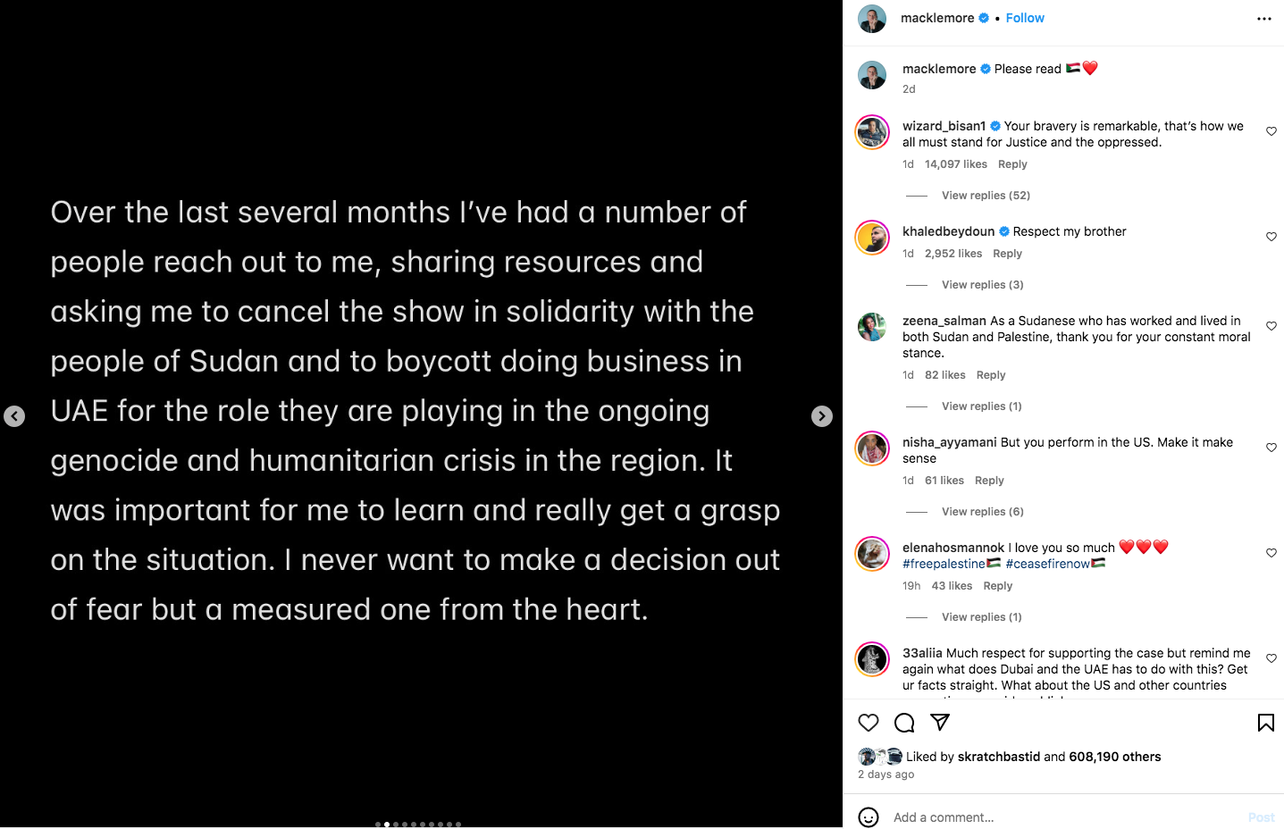 Macklemore has scrapped his upcoming concert in Dubai in protest to the United Arab Emirates’ role “in the ongoing genocide and humanitarian crisis” in Sudan.