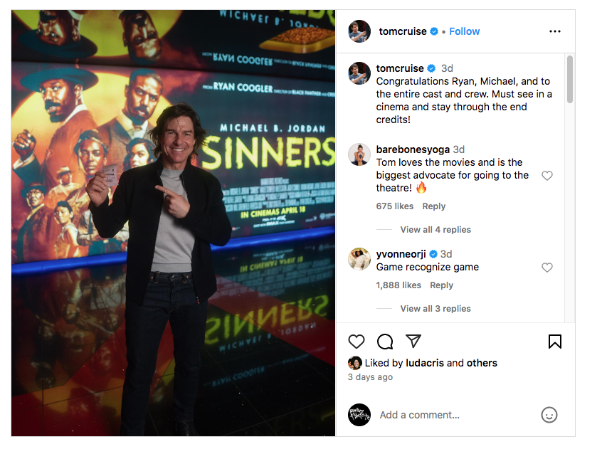 The Mission: Impossible star, known for championing the moviegoing experience, snapped a photo of himself pointing at a Sinners poster inside a theater, ticket in hand. Alongside the image, Cruise wrote, “Congratulations Ryan, Michael, and to the entire cast and crew. Must see in a cinema and stay through the end credits,” highlighting the film’s mid and post-credits scenes. Jordan, who portrays twin brothers Smoke and Stack in the film, reposted Cruise’s message on his Instagram Stories, adding a mind-blown emoji.