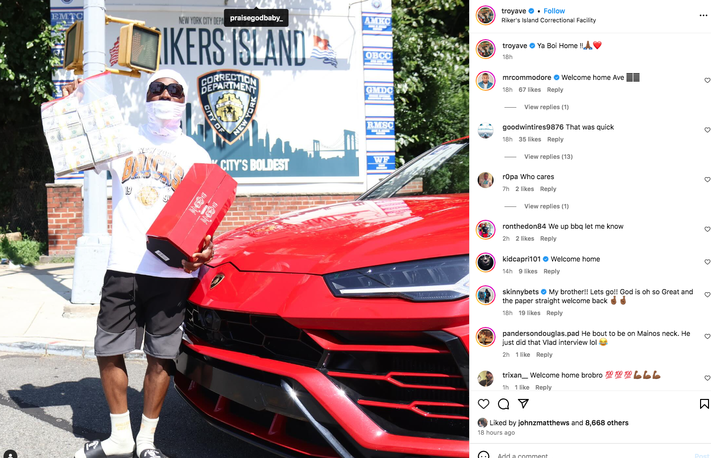 The rapper took to IG on August 26th and shared a photo of himself outside of Rikers Island wearing sunglasses, a mask and holding up a bag of cash. Heās also posing in front of a red sports car and holding a box of expensive liquor. Troy AveĀ reported to court in February to take responsibility for his role in the shooting involving podcast host Taxstone. The incident claimed the life of Troy Aveās bodyguard, Ronald āBangaā McPhatter. Troy Ave shared a video to his Instagram account before the hearing.
