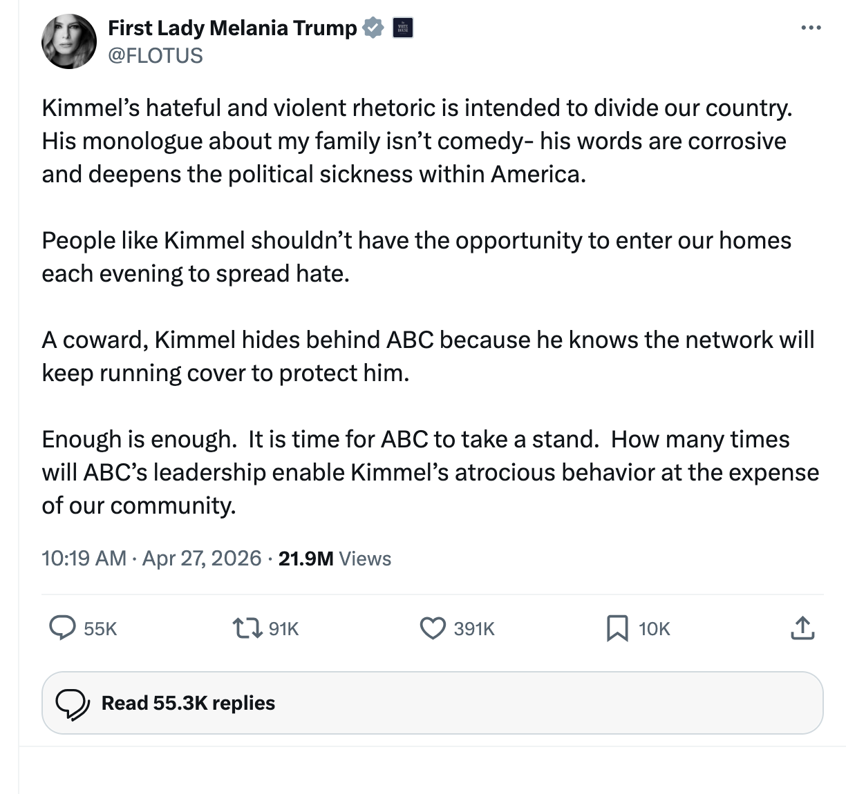 Hours earlier, Melania Trump had implied Kimmel should lose his job over the same comments. Kimmel’s monologue — which he made Thursday on “Jimmy Kimmel Live!,” days before the alleged gunman attempted to enter the event where President Trump, Melania Trump and other top officials were evacuated — included a joke that the first lady had “a glow like an expectant widow.”