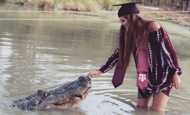 A college senior in Texas posed for her graduation photos alongside a massive alligator.